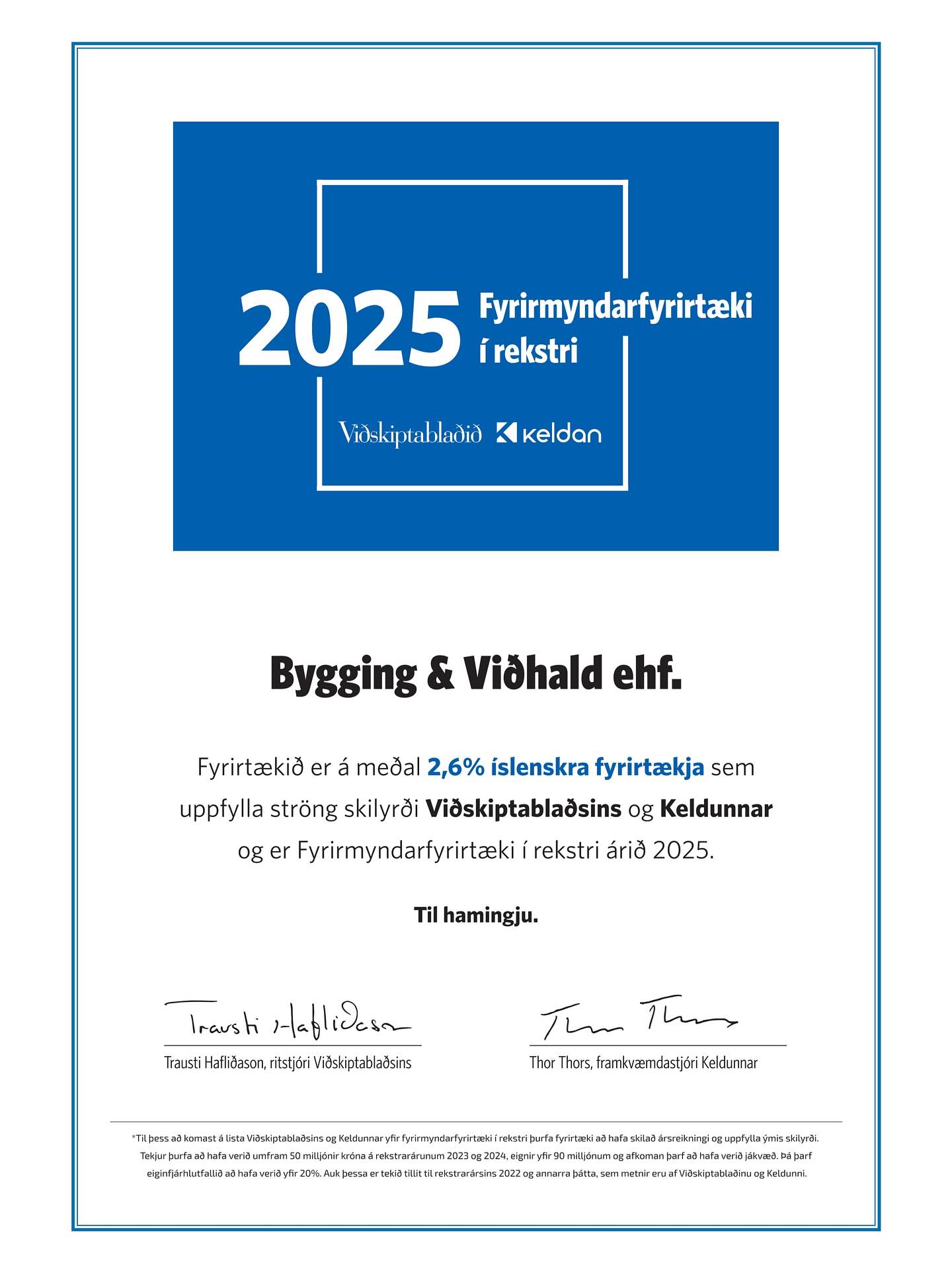 Bygging og viðhald er á mðdal 2,6% íslenskra fyrirtækja sem uppfylla ströng skilyrði Viðskiptablaðsins og Keldunnar og er Fyrirmyndarfyrirtæki í rekstri árið 2025